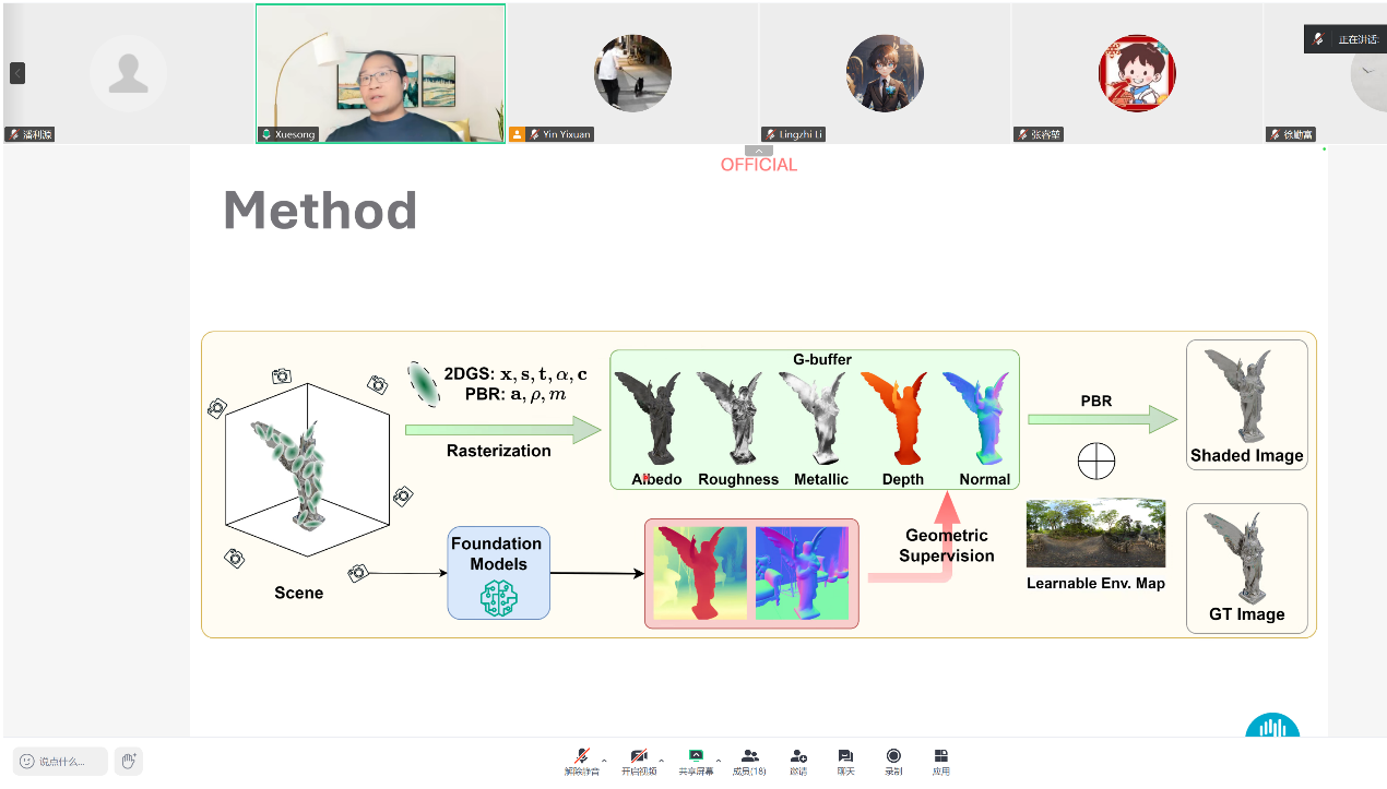 本次研讨会,李雪松博士分享了高斯泼溅技术的发展脉络及团队的最新研究成果,深入探讨了该技术从静态物体重建向动态场景重建拓展过程中的关键问题与解决方案。李博士首先介绍了三维高斯泼溅(3DGS)与二维高斯泼溅(2DGS)的技术基础。随后,他围绕团队针对该技术现存挑战开展的三项核心研究展开详细阐述:其一,GS-2DGS(已收录于CVPR 2025)项目创新性地引入基础模型先验知识指导高斯优化过程,成功解决了高反光物体重建这一业界难题;其二,S²GS(已发表于PR)项目提出全自监督分割方案,无需人工标注分割掩码即可在转台扫描场景中实现前景与背景的自动分离;其三,DGNS(已收录于ACM Multimedia 2025)项目融合高斯泼溅与神经隐式表面的技术优势,实现了基于单目视频的动态场景重建。除技术成果外,李博士还结合自身丰富经验,剖析了该领域的开放问题与未来发展方向。