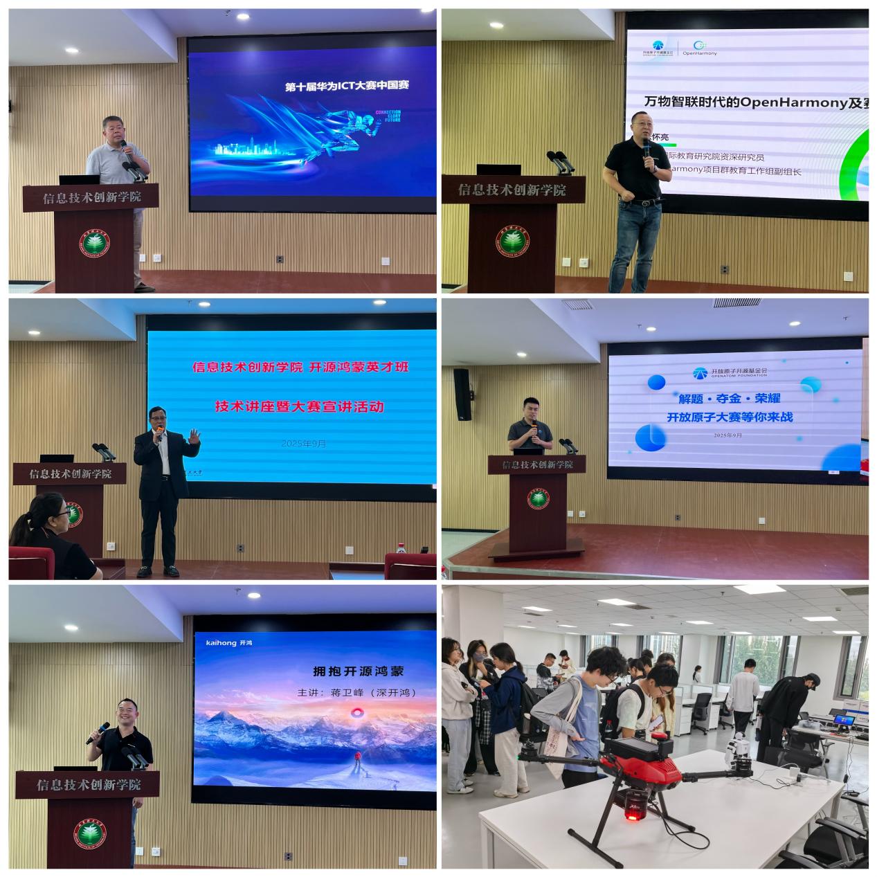 同日,开源鸿蒙英才班讲座在良乡校区信创A楼374报告厅举行,100余名信创学院教师及英才班学生参与,徐秋华主持活动。吴长高介绍学院背景与英才班培养目标,聚焦鸿蒙人才培育与科研攻关;曹海清、张怀亮、王崇文分别讲解开源大赛规则、鸿蒙技术特性及华为ICT大赛备赛要点;蒋卫峰分享技术创新与鸿蒙实践结合的经验并现场展示设备。活动尾声,师生共同参观5500平方米的产学研基地,涵盖开放实验室与自习室等功能区域。